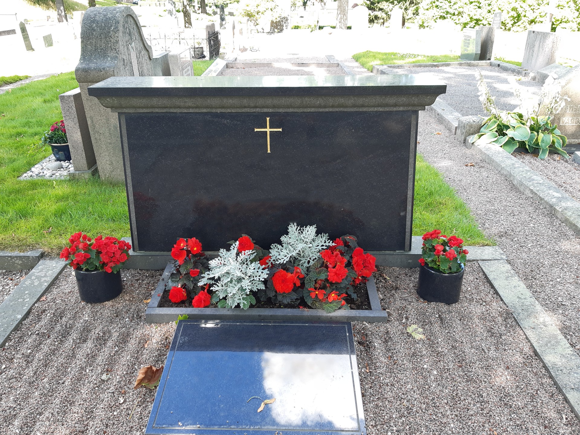 innebär beroende på gravplatsens utformning, plantering av upp till 6 stycken blomplantor. Valet av blommor görs av kyrkogårdsförvaltningen och kan variera på gravplatserna och från år till år. Planteringen sker i början av juni.