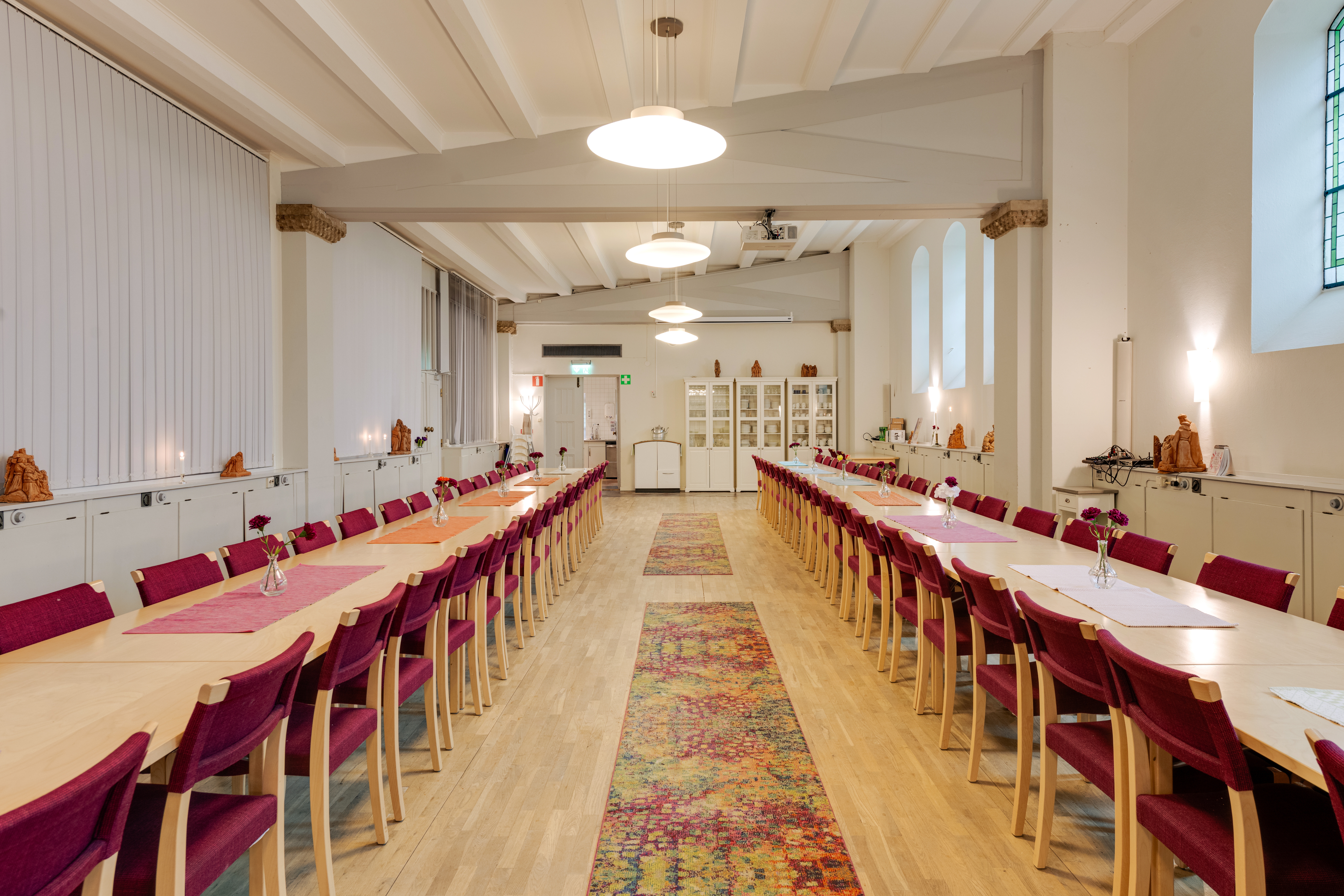 I församlingssalen är möblerad med 14 bord och 84 stolar. 40 extra stolar (alltså totalt 124 platser).