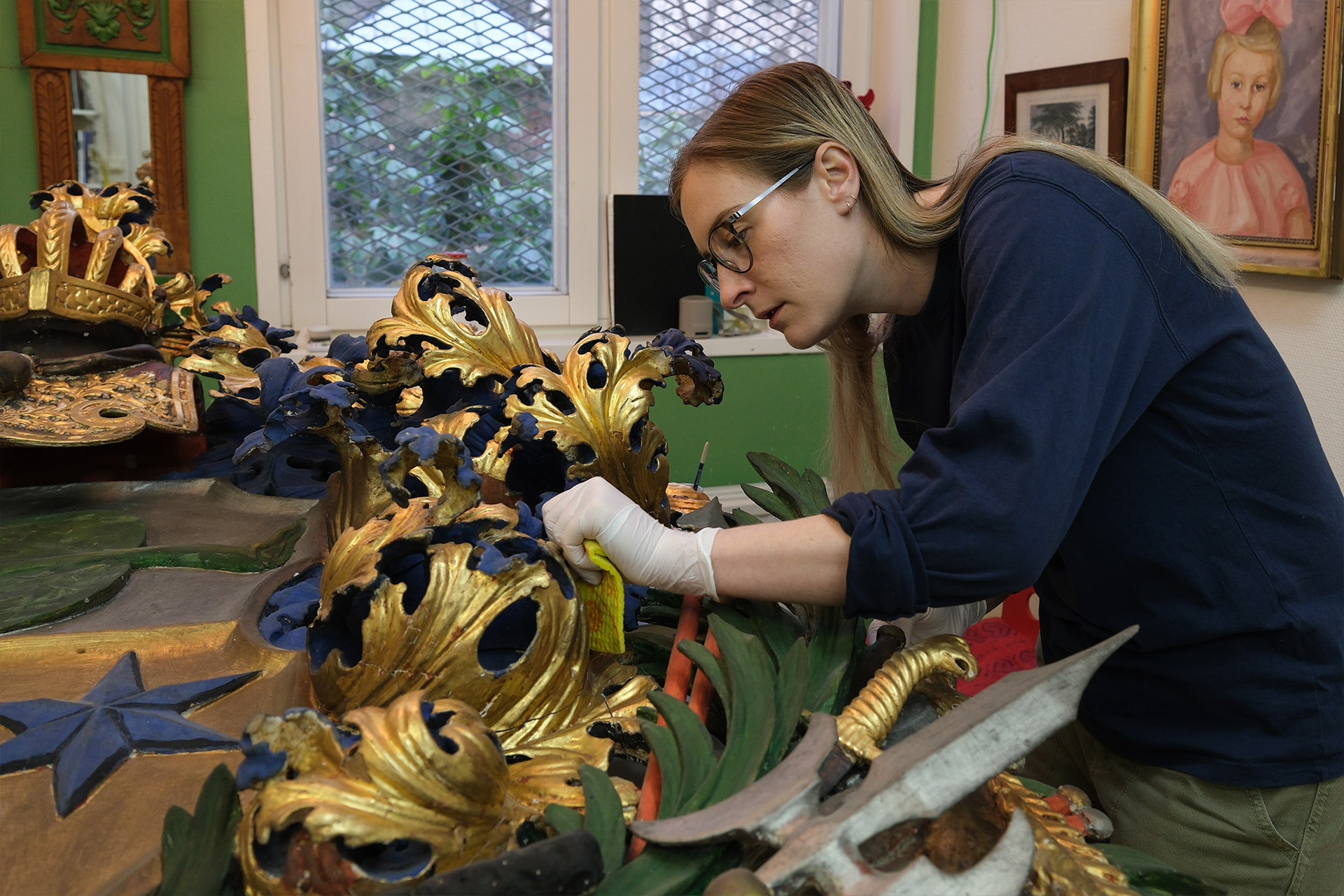 Det krävs mycket tålamod, men framför allt kunskap när en 319 år gammal vapensköld ska tas om hand. Men Lina har full koll och använder olika metoder till olika material.