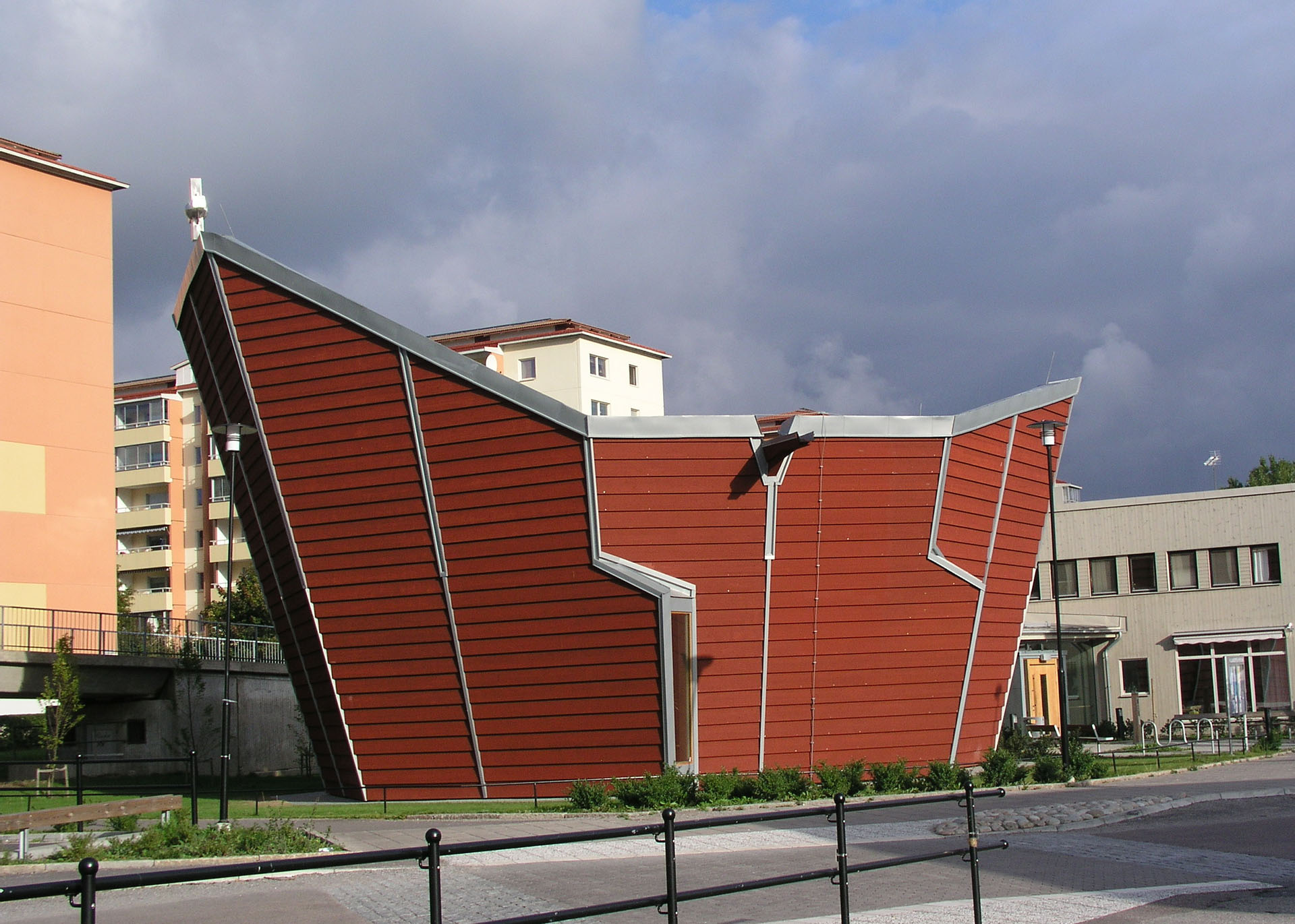 Planformen är oktagonens. På den åttkantiga bottenplattan står väggar som lutar 15 grader. Väggarna når olika höjd och får utifrån sett formen av ett skepp.