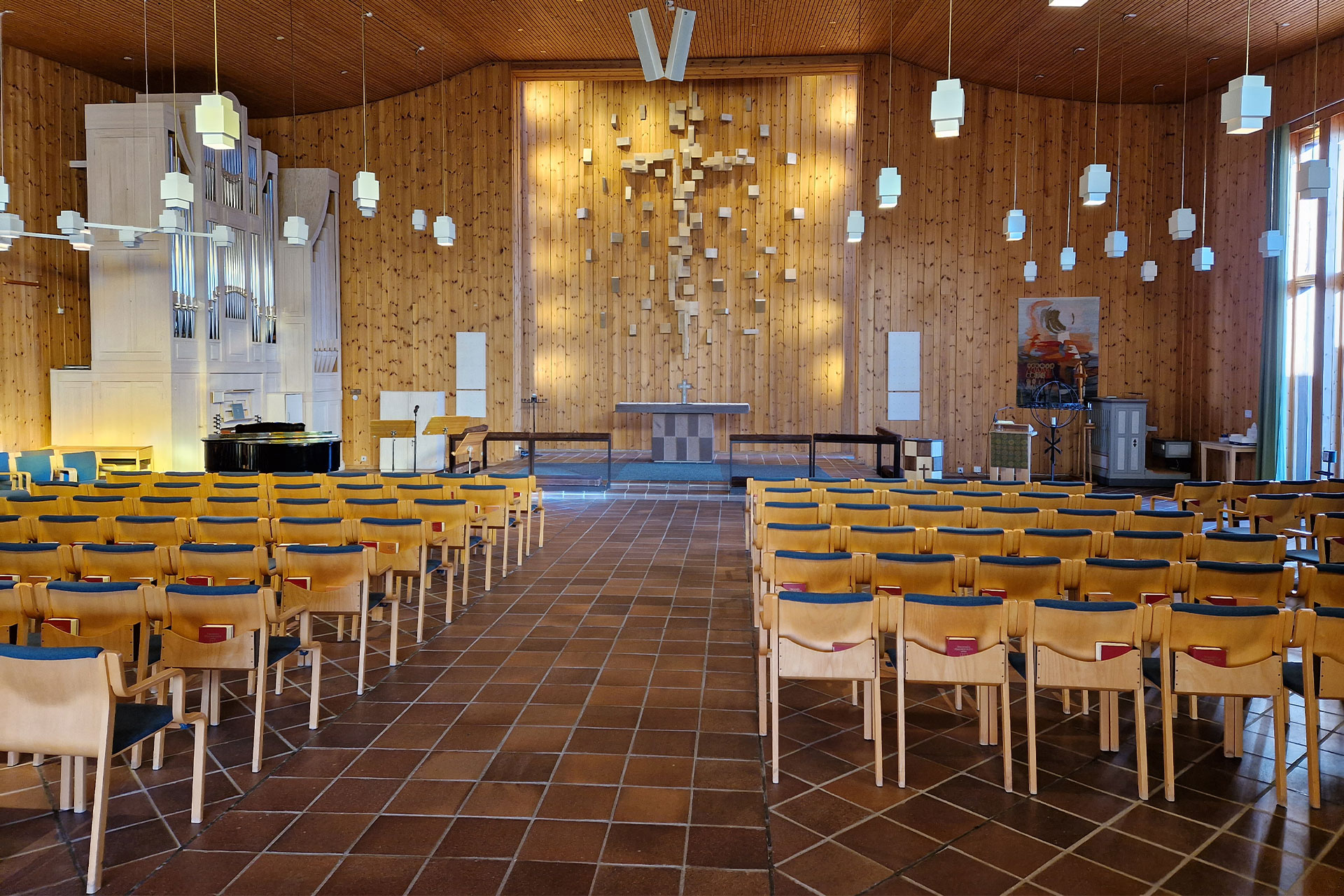 På ytterväggen hänger ett förgyllt kors. Tolv enkla träskulpturer som symboliserar de tolv apostlarna pryder kyrkans korvägg. Korset och skulpturerna vill berätta för oss om att Kristus och hans kyrka är en gemenskap för oss alla.