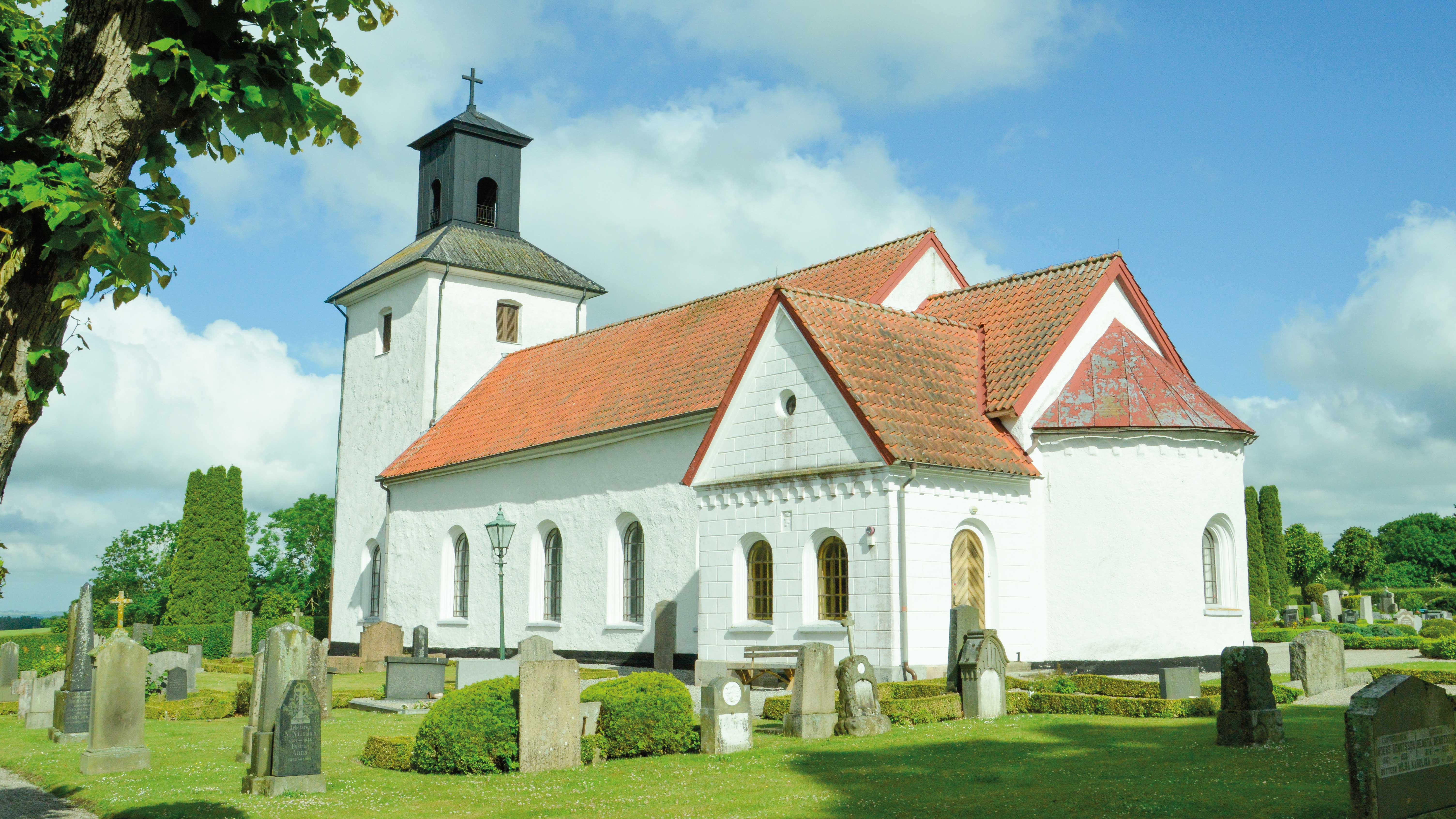 På kyrkogården norr om kyrkan finns ett gravkor tillhörande ätten Schwerin, som var en av släkter som hörde hemma på närliggande Hjularöds slott. Och i utbyggnaden kallad nykyrkan finns flera epitafier, alltså minnessköldar över släkter knutna till slottet. Ett par visar det Buchwaldska vapnet. Det ena av dessa minner om baron Friedrich von Buchwald som dog i Wismar 1693. Det andra epitafiet är över baron Christian Albrecht von Buchwald som dog 1706. Under koret finns ett gravkor från 1600-talet där medlemmar av släkterna Buchwald och Liewen vilar.