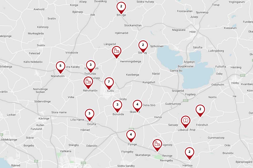 Karta över kyrkor, kapell och församlingshem i Svenska kyrkan Eslöv