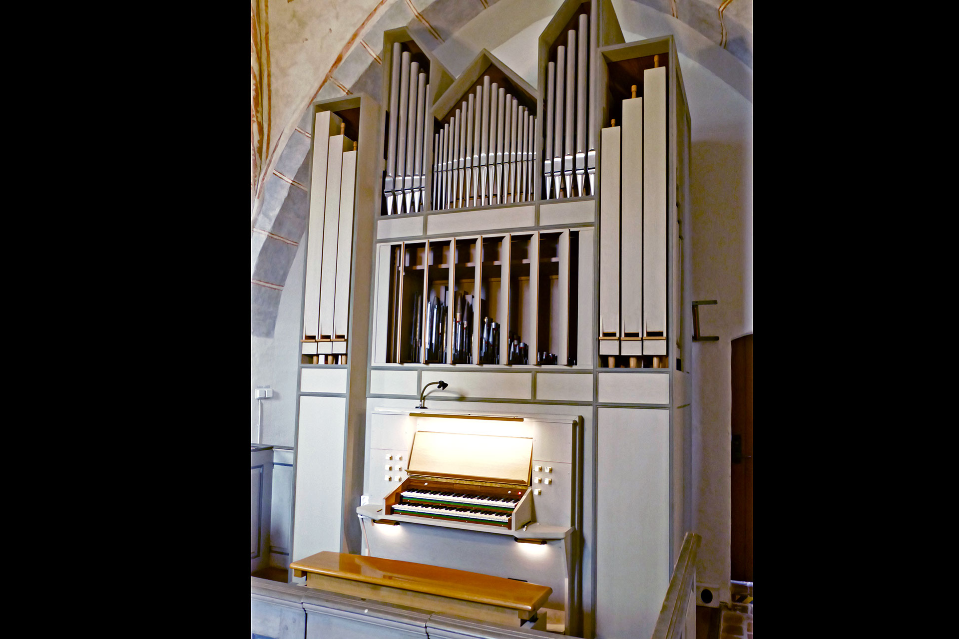 1965. Ljudande Gedacktbas 16’ F#- a0 (de minsta på gavlarna), Principal 4’ C-d1. Orgelhus av ek och ekfanér. Skjutluckor på baksidan. Arkitekt var E Graebe enligt kyrkobeskrivning.