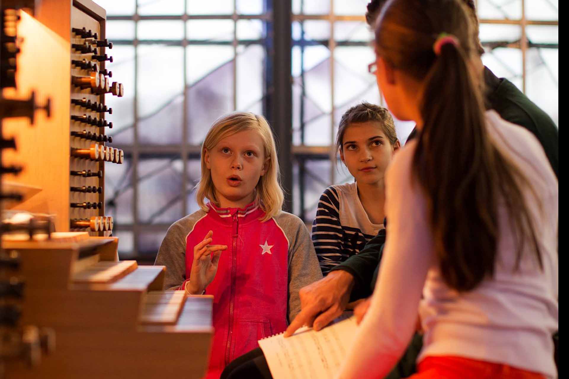Orgeln har oändliga möjligheter att låta både högt och lågt, starkt och svagt. I den gömmer sig flöjter, oboer, trumpeter, fagotter; ja, en hel orkester! Till det behöver du både händerna och fötterna när du spelar.