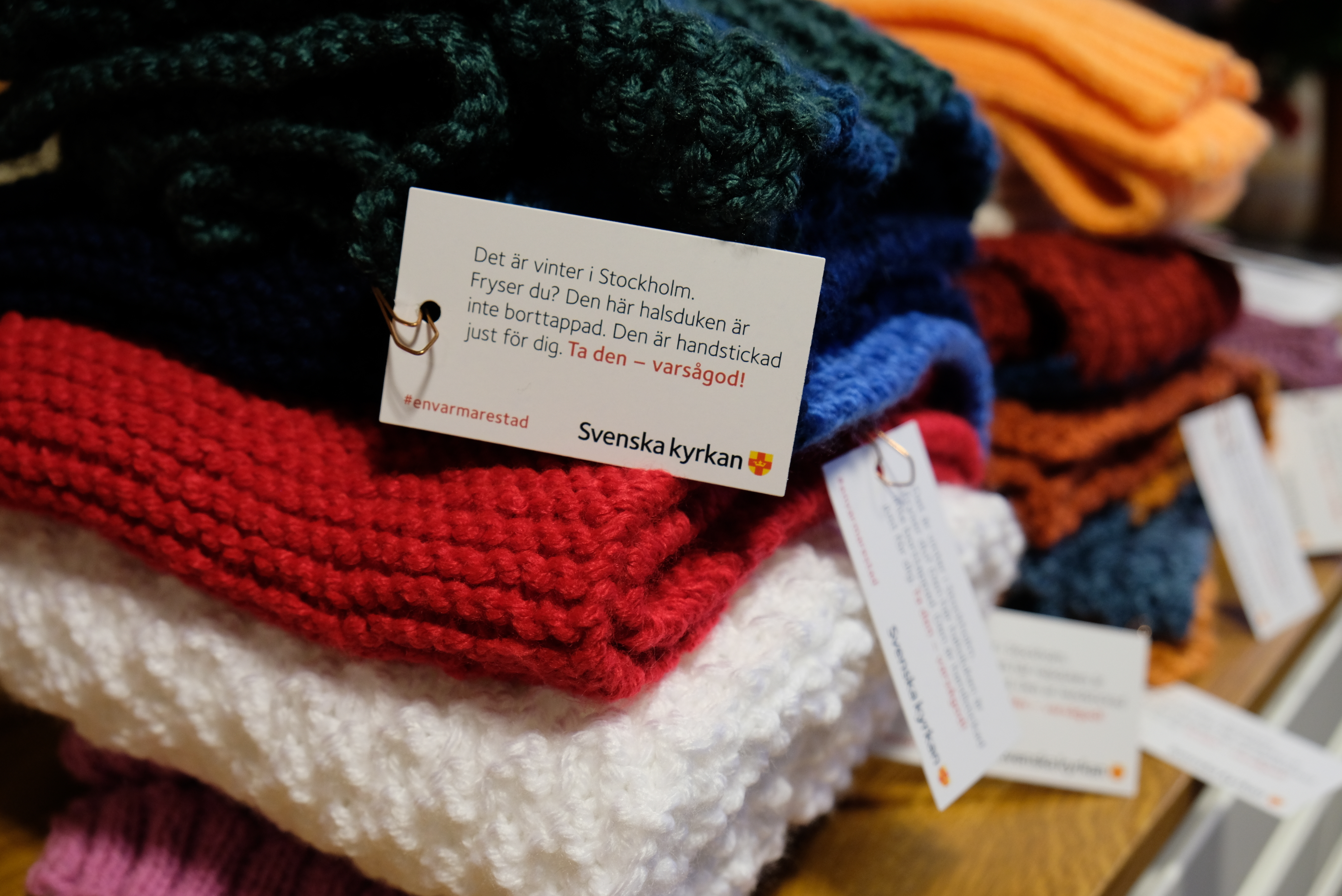 Varje halsduk hade en lapp med en hälsning på sig: ”Det är vinter i Stockholm. Fryser du? Den här halsduken är inte borttappad. Den är handgjord just för dig. Ta den – varsågod! #envarmarestad.”