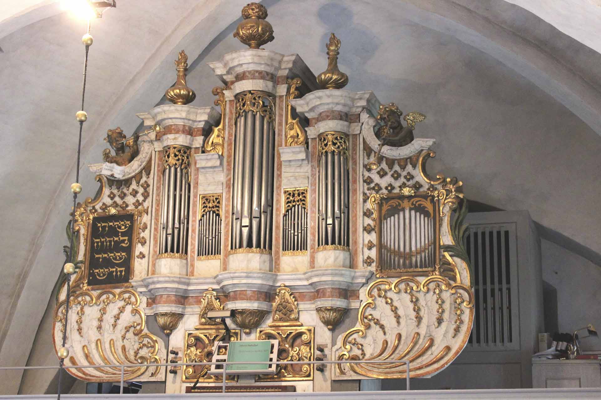 I den ena vingen finns en svängbar psalmnummer tavla, i den andra en en tavla med inskription på hebreiska. Sannolikt tillkom nu även de två rikt skulpterade fyllningarna i sockeln. Pipfältsornamenten och de krönande flamfaten däremot fanns från början. De är gjorda av snickarmästare Hans Wäst 1699 och förgyllda av målaremästaren Hindrick Krantz, som också marmorerade de plana ytorna. Troligt är att han också försilvrade fasadpiporna.
