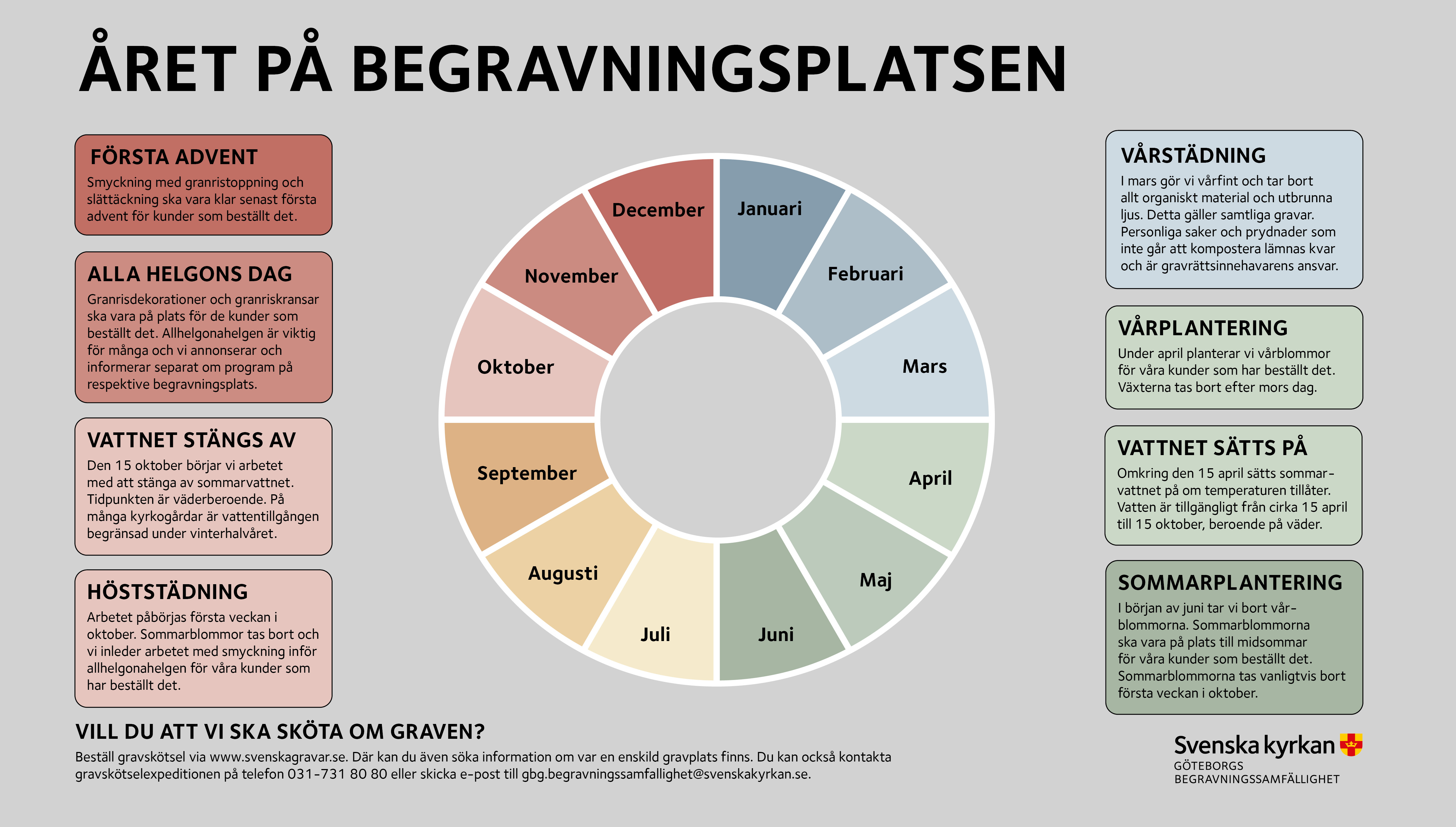 När sätts sommarvattnet på? När planteras vårblommorna? I vårt årshjul ser du vad som händer på begravningsplatserna vid olika tidpunkter.