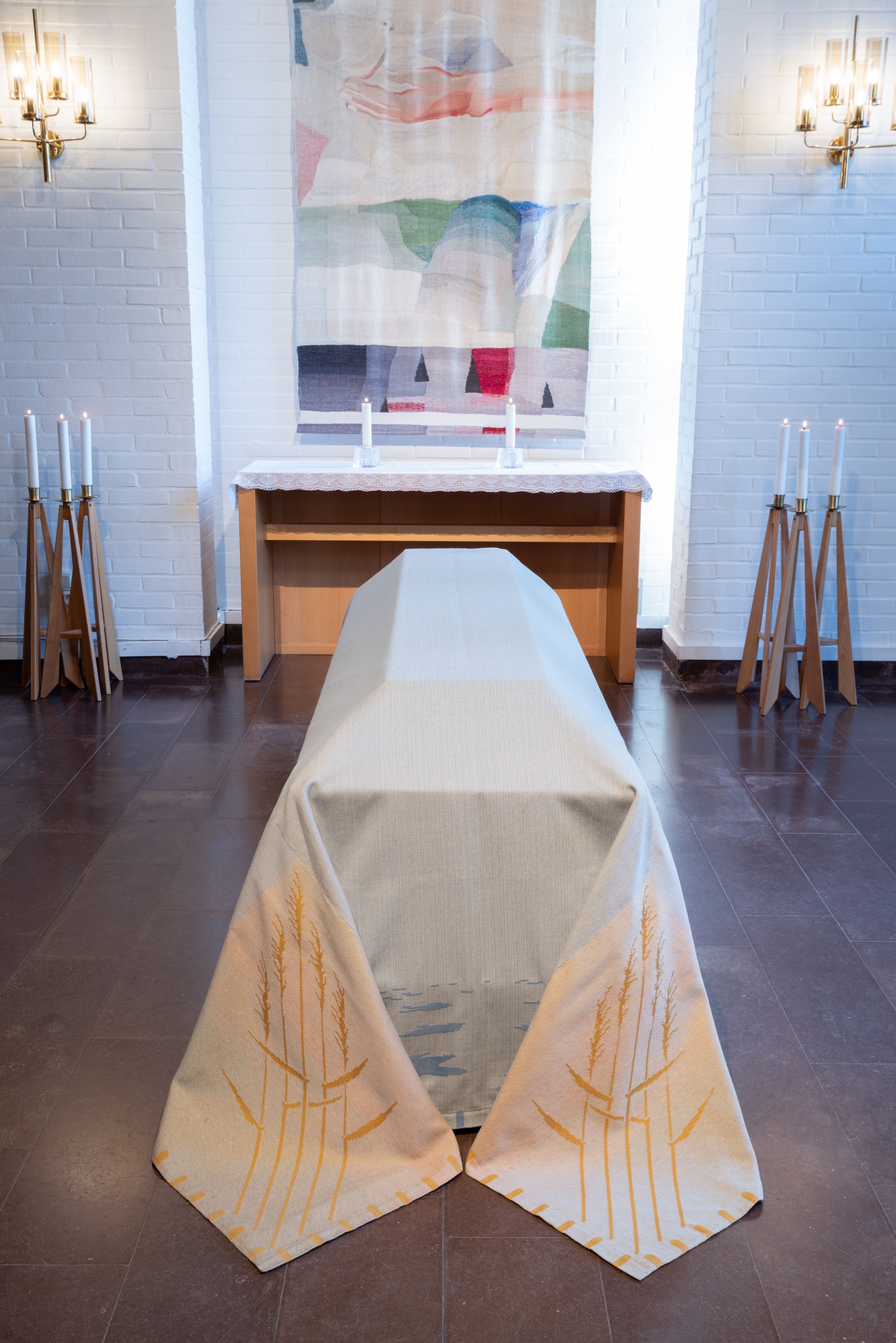 Bårtäcket tas av i kapellet när begravningsakten är avslutad.
