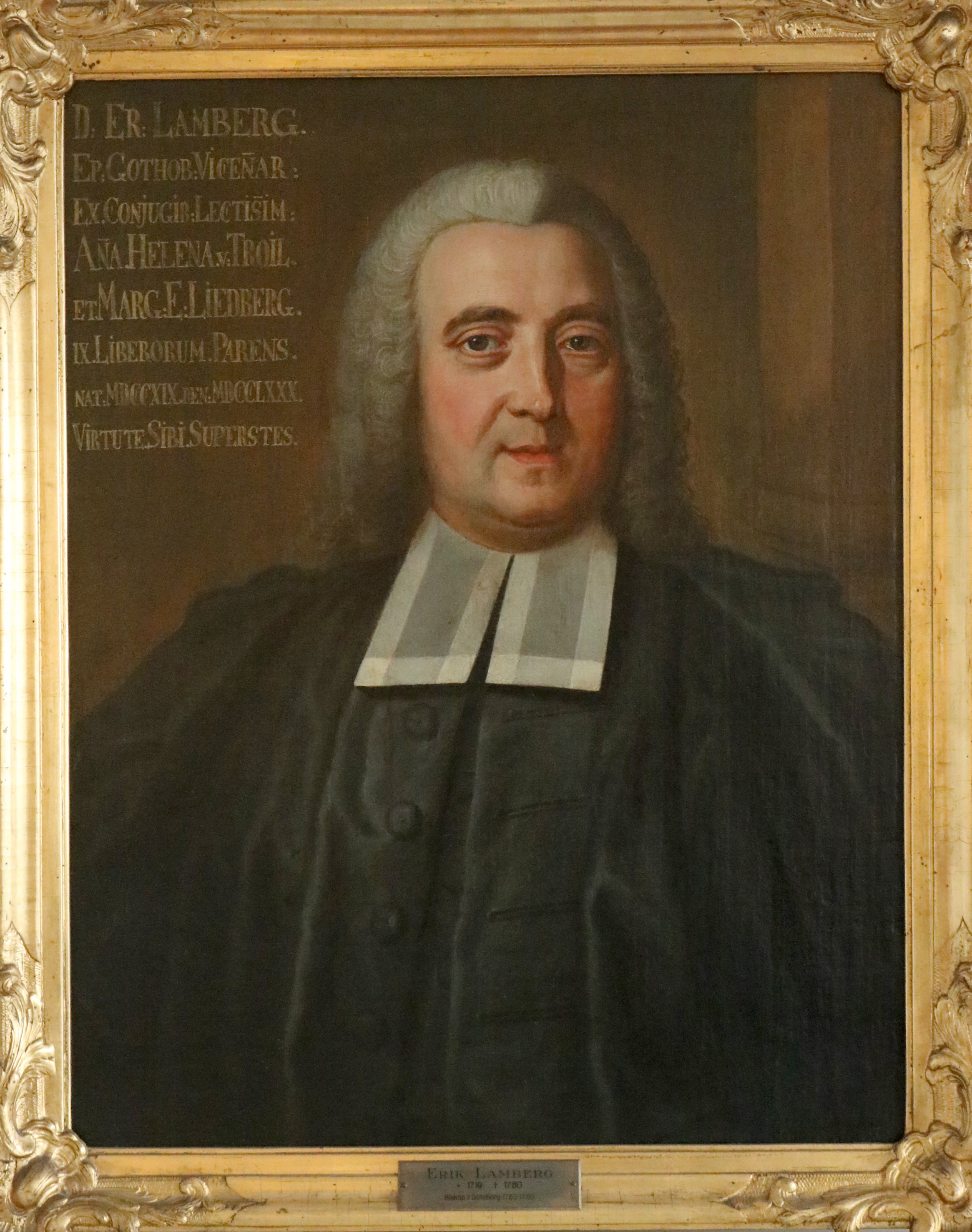 Lamberg (1760-80) var hovpredikant och biskopsvigdes av sin svärfar ärkebiskop Troilius. Han är i hög grad förknippat med den s.k. Swedenborgska striden. Lamberg ingrep mot de alltför talrika lovdagarna i skolan och vid riksdagarna var han mycket verksam. Porträttet avslöjar en ny biskopstyp genom allt gammalt som försvunnit.