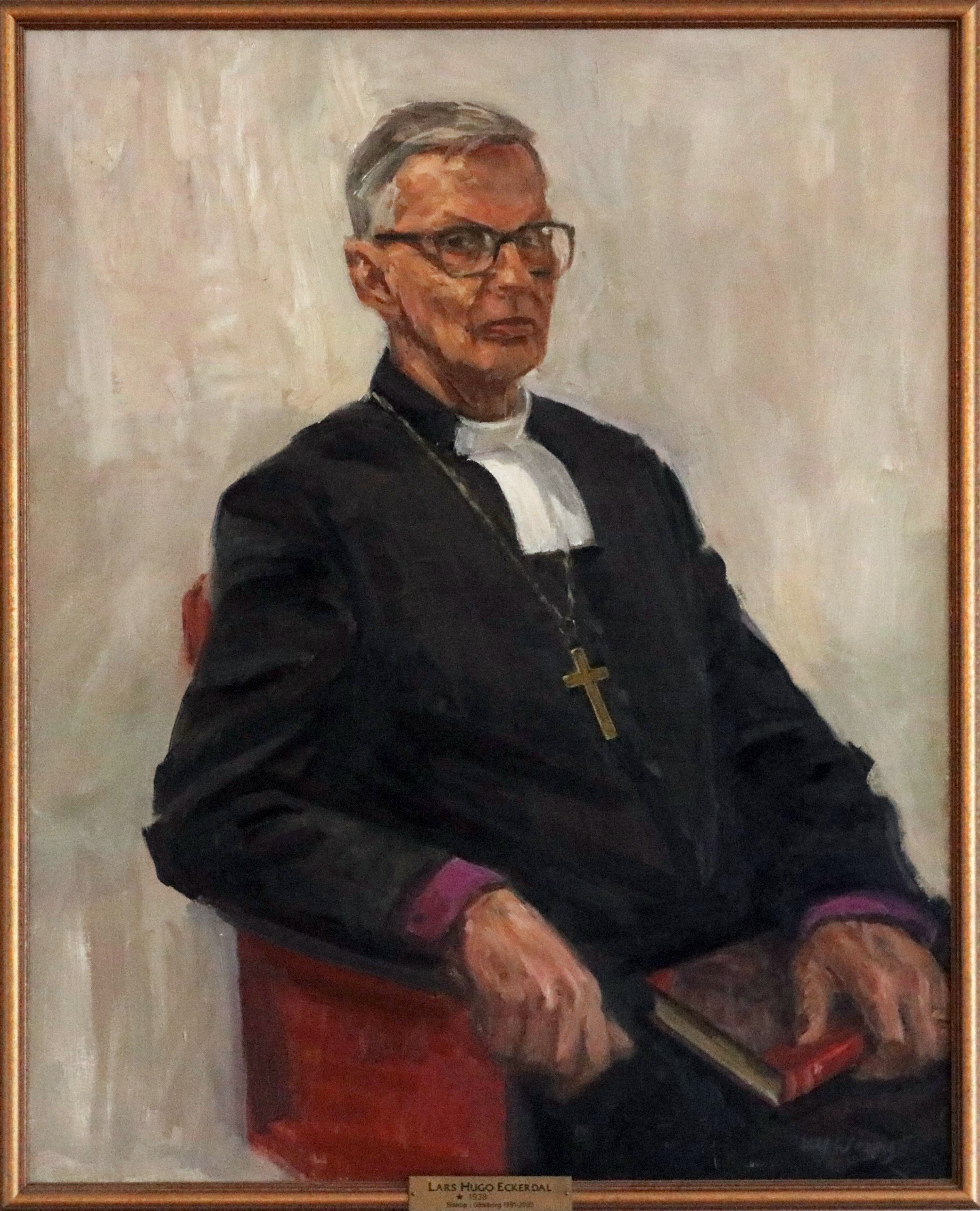 Oljemålning av Ulf Wrangö (f 1950), som också målat biskop Koskinen i Visby. Med Lars Eckerdal återgick biskopsporträtten till den äldre traditionen att avbilda biskopen i domkapitlet. Samtidigt innebar kavajen en modernisering jämfört med de äldre porträtten i kaftan. Biskopsvapnet – som infördes i hela landet på 1960-talet – finns inte längre med på porträttet. Lars Eckerdals valspråk var ”Omnia in nomine Jesu” – Allt i Jesu namn. En kuriositet är att när biskopen skulle hålla i en bok, som liknade en kyrkohandbok, blev det Ragnar Brings Galaterbrevskommentar, något som dock inte går att urskilja på porträttet.