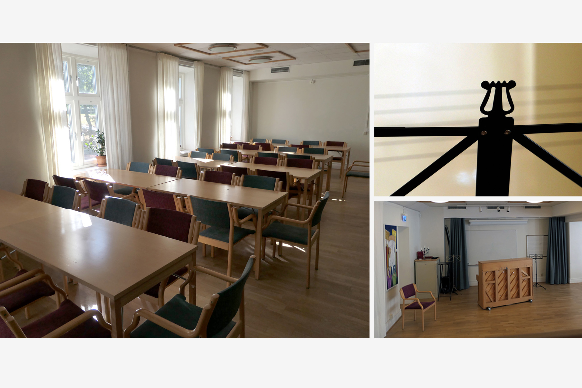 Här finns piano, högtalaranläggning och projektor. Projektorn behöver bokas i förväg. Det finns två filmdukar, en som sitter fast i väggen och en som går att flytta. Den flyttbara duken är 160x200 cm.