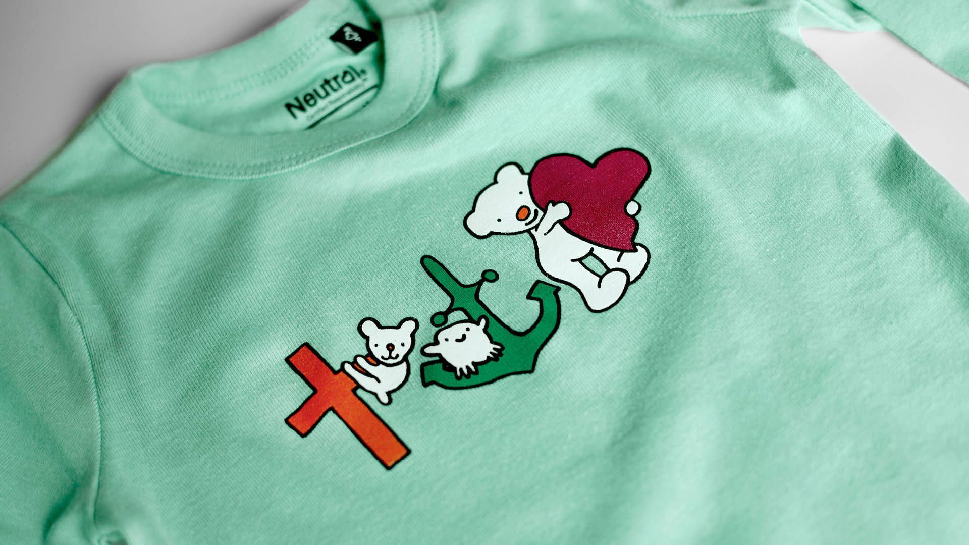 På babybodyns motiv leker små djur med korset, ankaret och hjärtat. Detta kan symbolisera tro, hopp och kärlek till hela skapelsen såsom djur, miljö, klimat och natur.