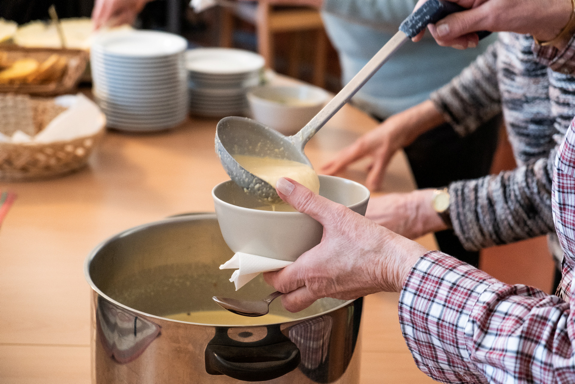 Mötesplats med sopplunch (40 kr), sång, samtal och fika.