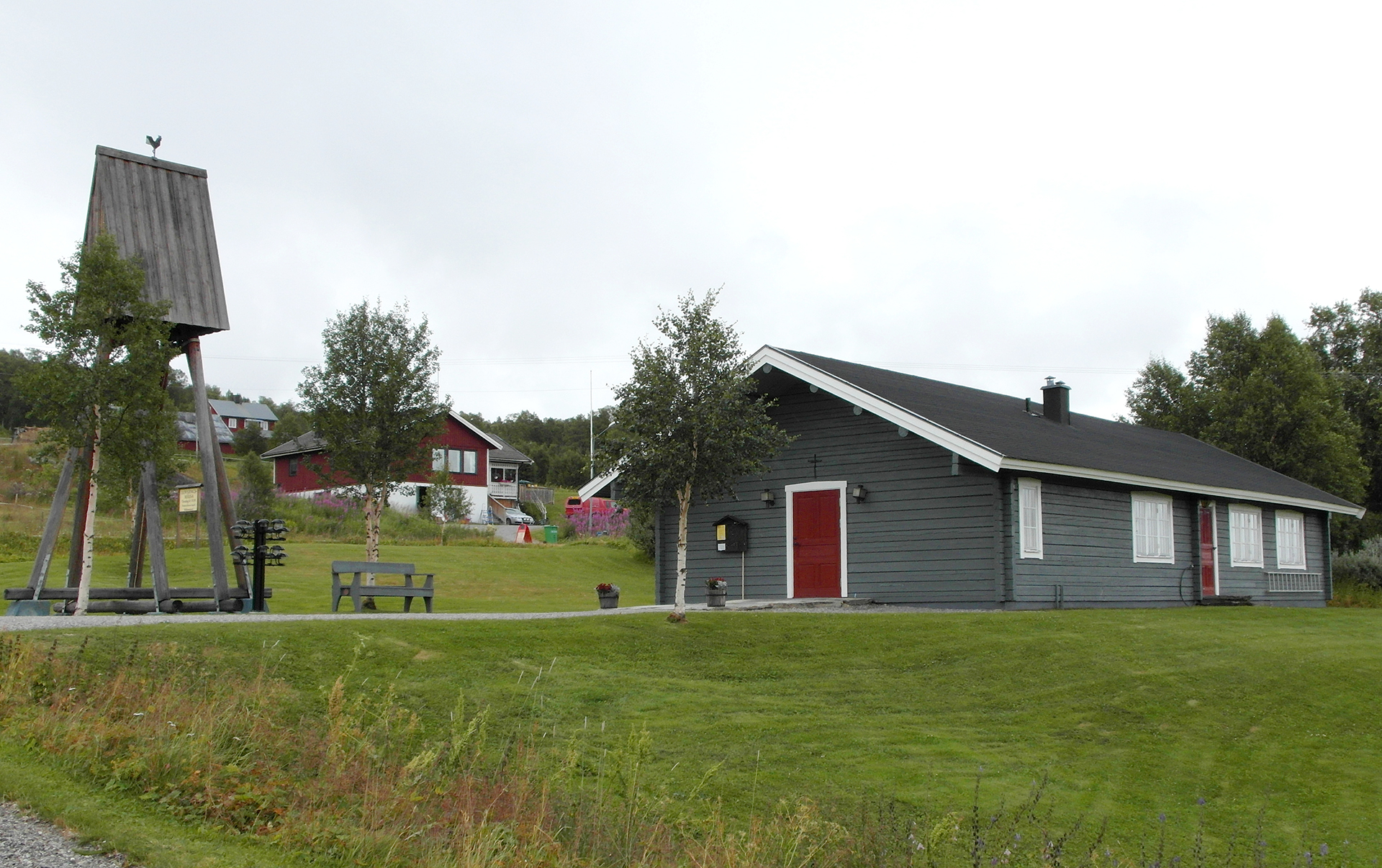 Fjällkapellet är ett lågt timrat hus som rymmer dels kyrksal, dels bisättningsrum och andra förvaringsutrymmen.