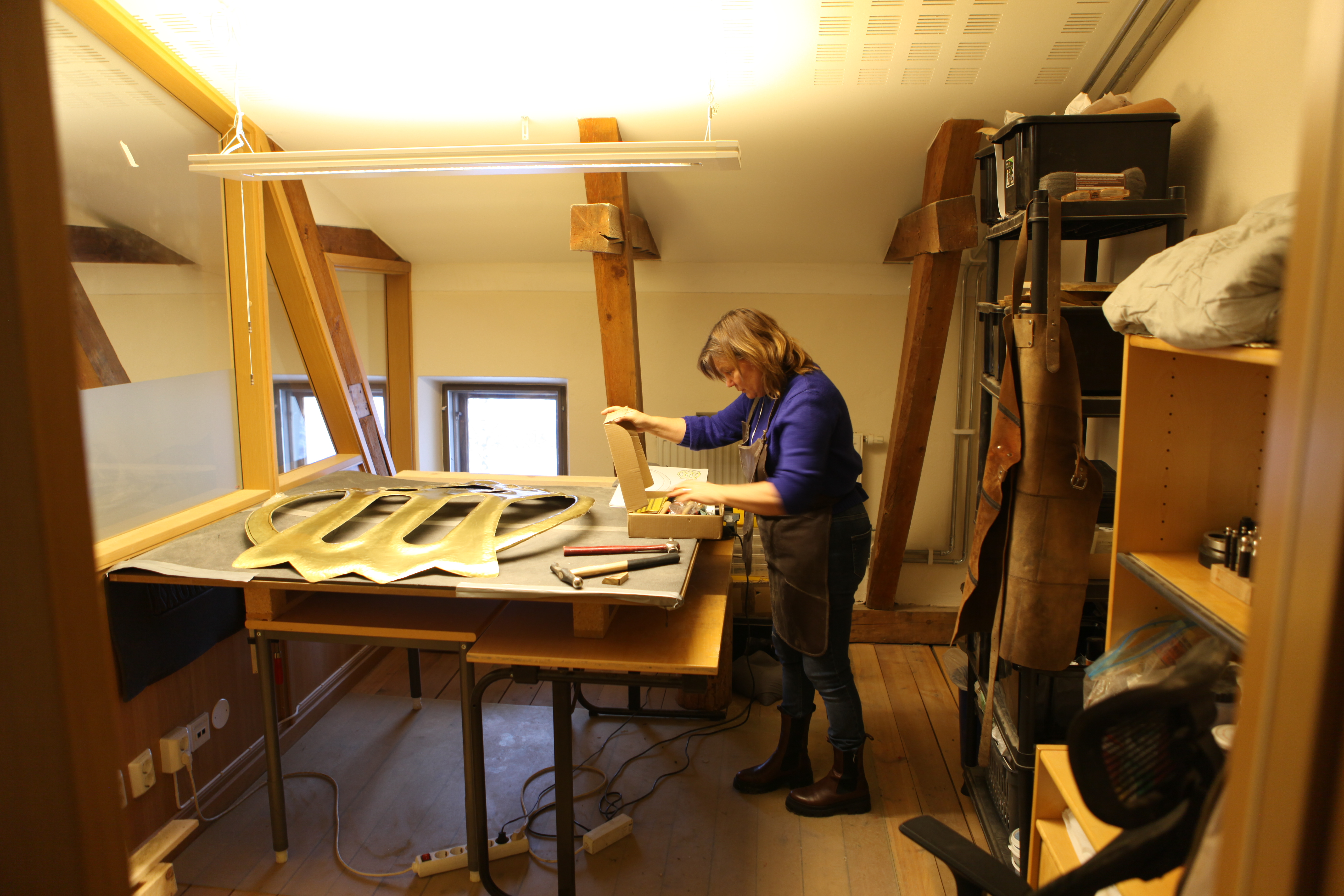 På övervåningen i det samiska muséet Gaaltije i Östersund, har Annamaria Marsfjell en provisorisk ateljé och verkstad. Granne med kontorsrummen hamrar hon långsamt fram Stora kyrkans nya konstverk i millimetertjock mässingsplåt, en Mariamalja.  – Dom säger att jag inte stör när jag bankar i plåten men jag håller ändå igen lite, säger hon och skrattar, i julas när alla hade ledigt, då tog jag i ordentligt.