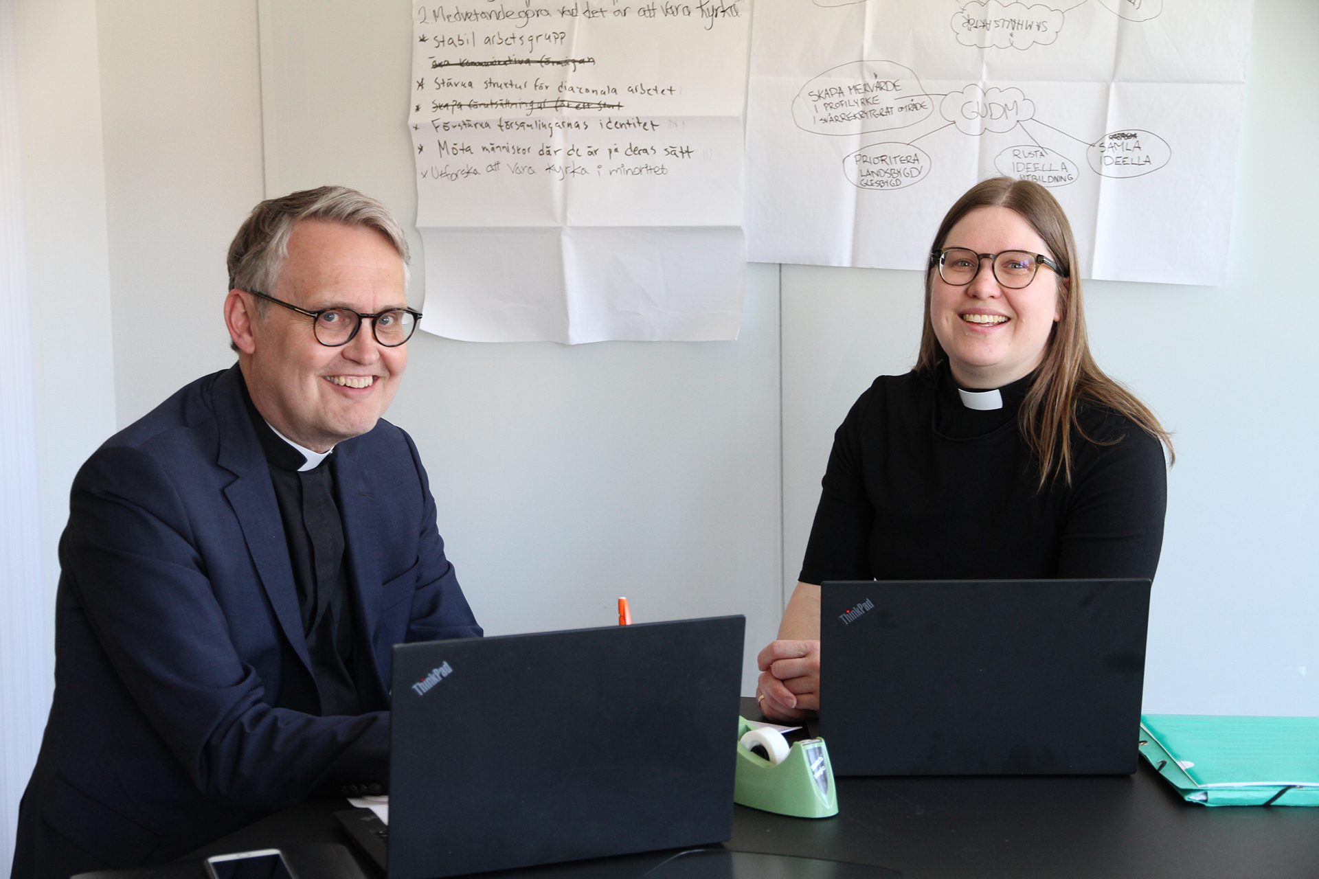Bildtext: Stiftskansliets Göran Lundstedt och Elin Lockneus har arbetat med de undersökningar och analyser, bland annat åtta idéverkstäder stiftet runt, som lett till fram till framtidsprogrammet. Foto: Maria Eddebo Persson.