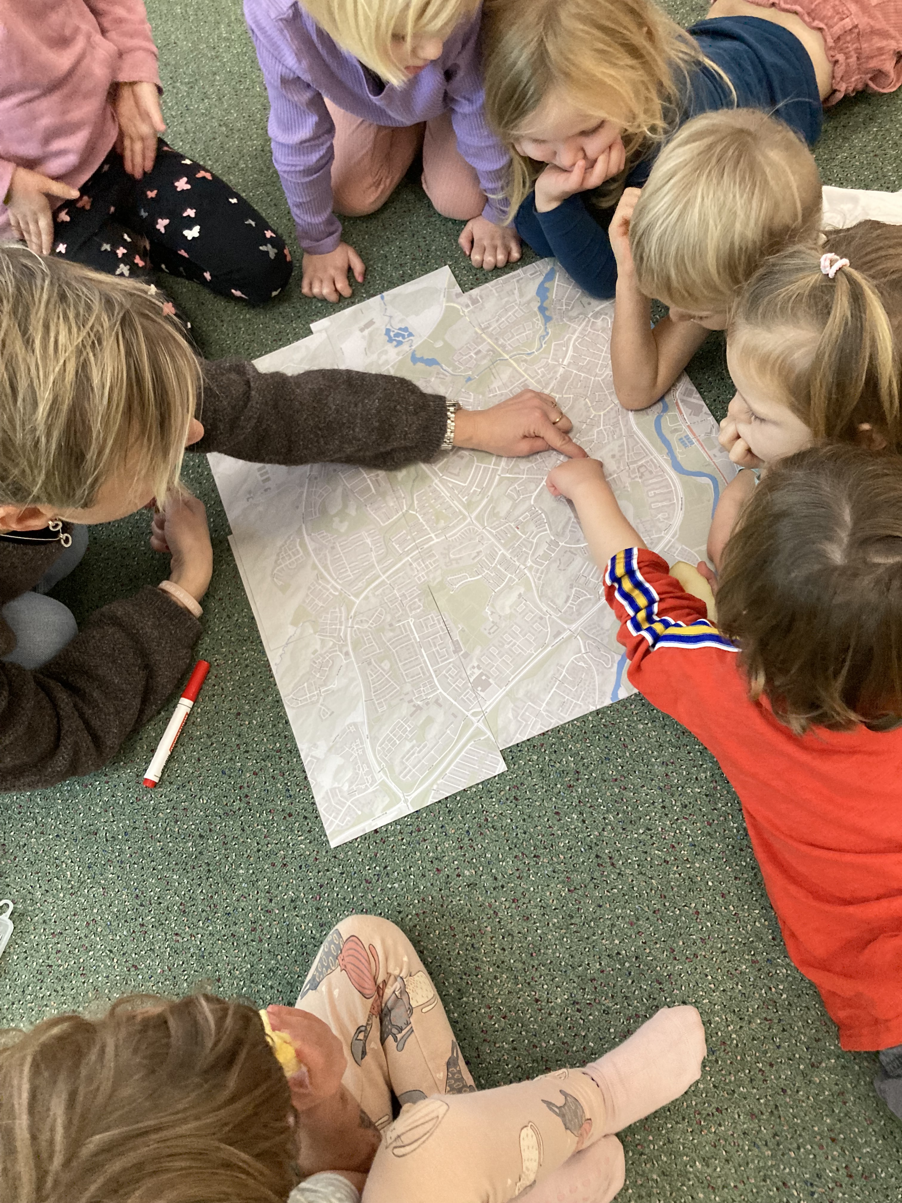På kartorna har kompisarna fått leta reda på var Himlaliv och sina egna hus finns och markerat dessa. Några kunde sin adress och vilken siffra det var på huset, medan några kompisar fick ta reda på det tillsammans med förälder eller pedagog. I gruppen blev det en upptäckt att se hur olika långt alla har för att komma till förskolan, någon har lång väg medan en annan bor nästan granne med Himlaliv. För några kompisar blev det även en upptäckt att deras egna hus låg nära varandra. Vi har förstått genom flera föräldrar att det har frågats efter adresser och kartor hemma och att det blivit samtal om hur långt det är till olika släktingar och vänner.