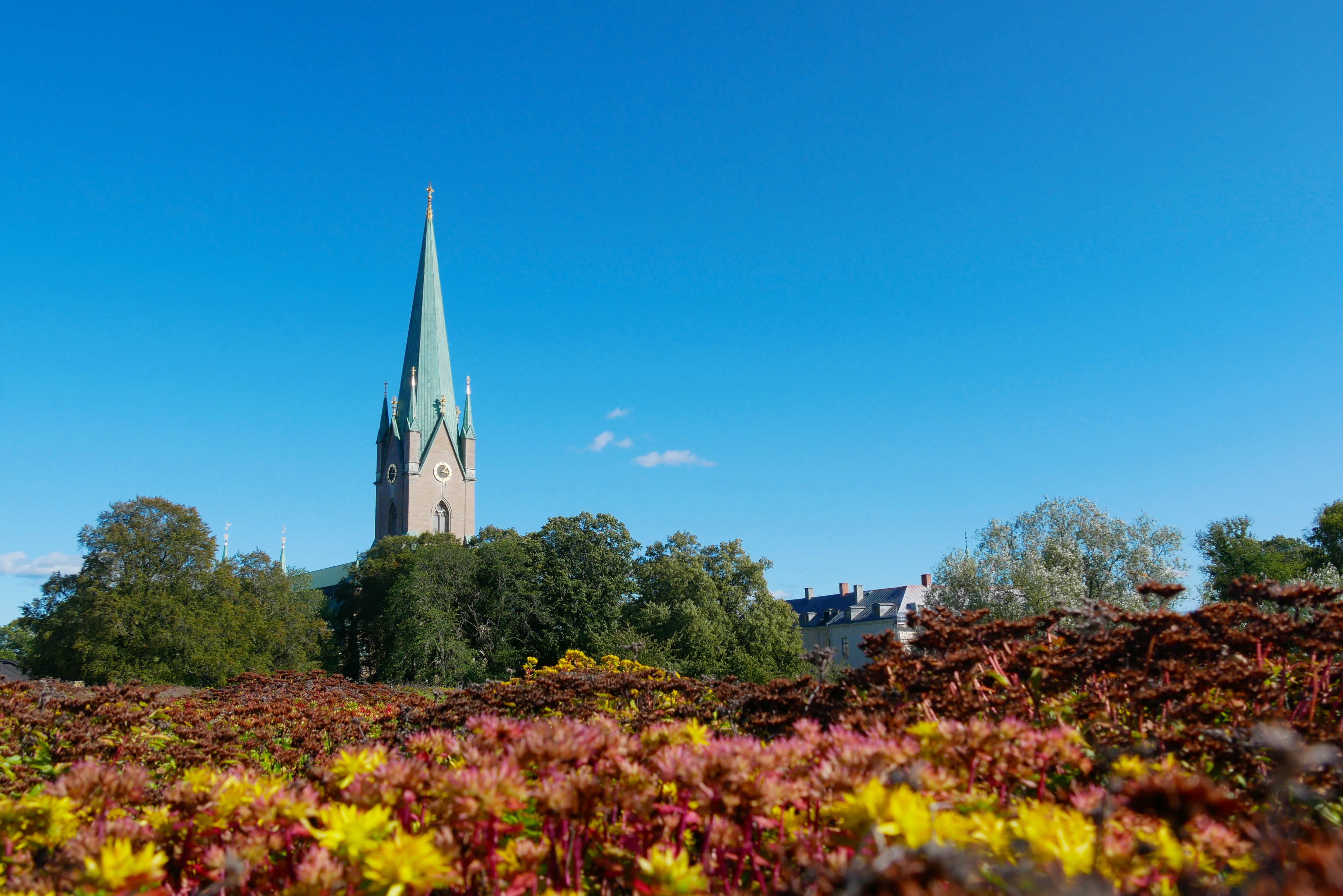 Vitt hus med grön dörr i Domkyrkoparken, intill Stadshuset.