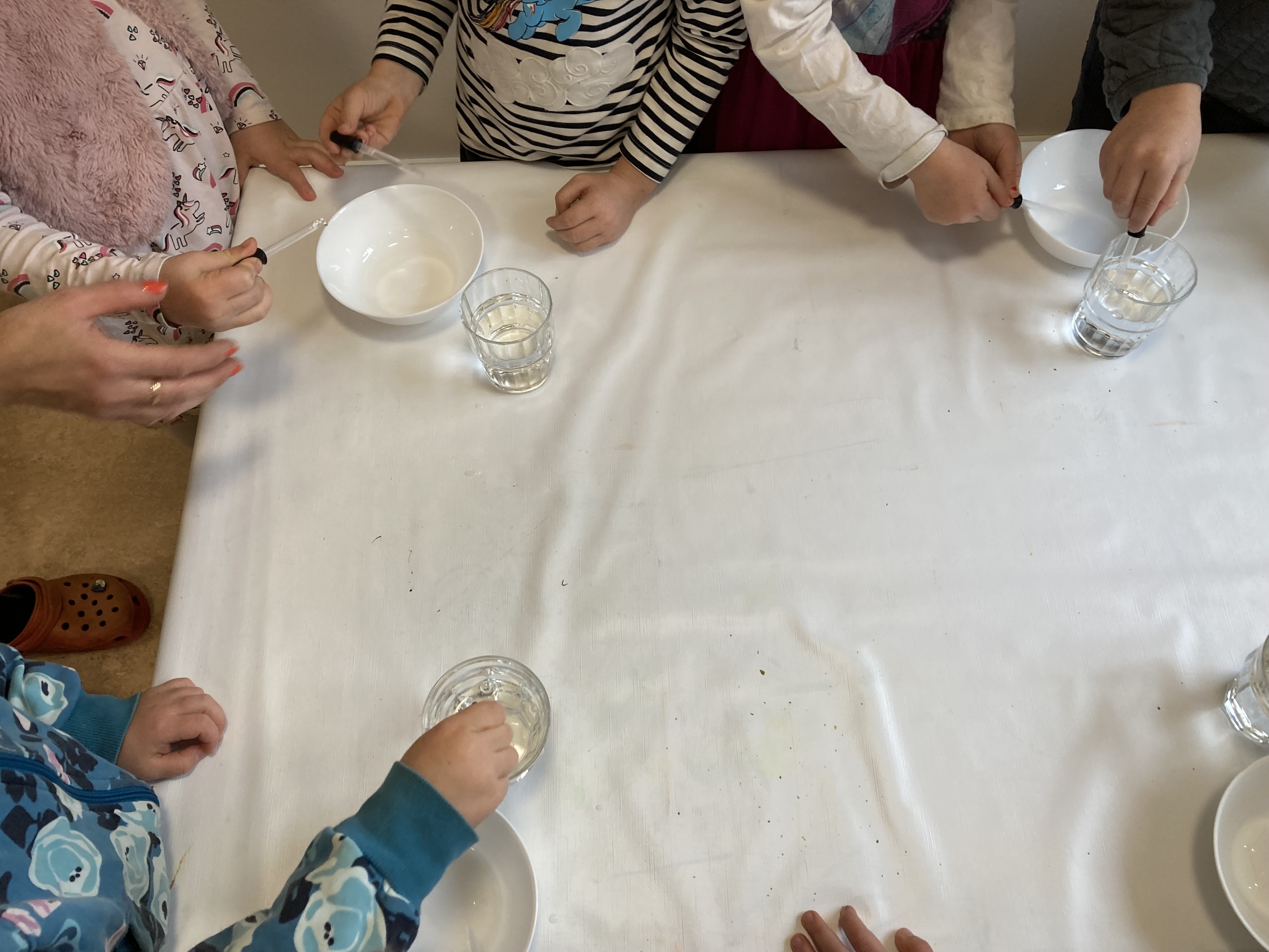 Vi startade projektet med att dela in barnen i små grupper och samtalade om var det finns vatten i vår närhet och var vattnet kommer ifrån. Vi gick till kyrkan tillsammans och undersökte om det fanns vatten i kyrkorummet och vad det i så fall används till. I ateljén undersökte vi experiment med vatten genom experiment om ytspänning och ”russinhissen”. Allt eftersom introducerade vi ett experiment i taget för barnen så att de kan prova själva. Barnen fick följa en bildinstruktion för att göra olika experimentet.