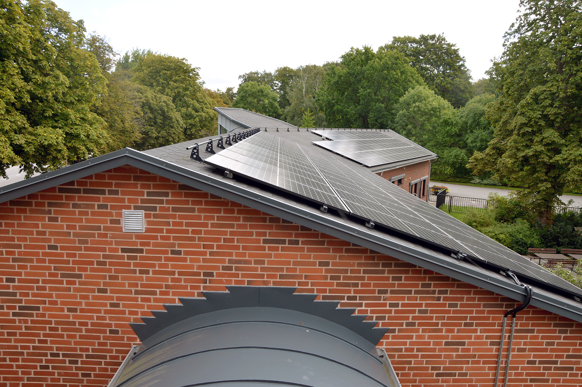 Nästan sexhundra kvadratmeter solpaneler monterades under sommarens varmaste veckor, på taken till verkstadsbyggnader och på administrationens hus.