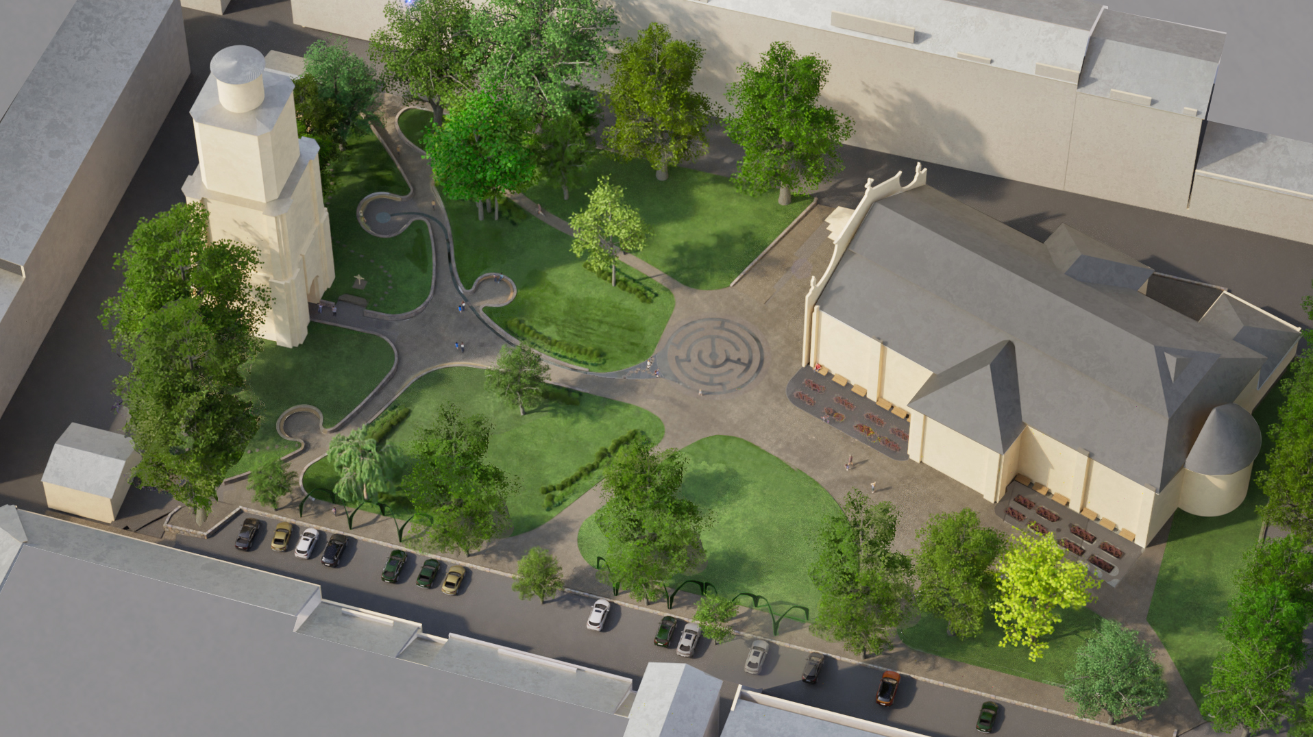 Det planeras för blomsterrabatter med inspiration av klosterträdgård, en vattenspegel och ökad tillgänglighet i form av planande gångar in i parken istället för trappor.