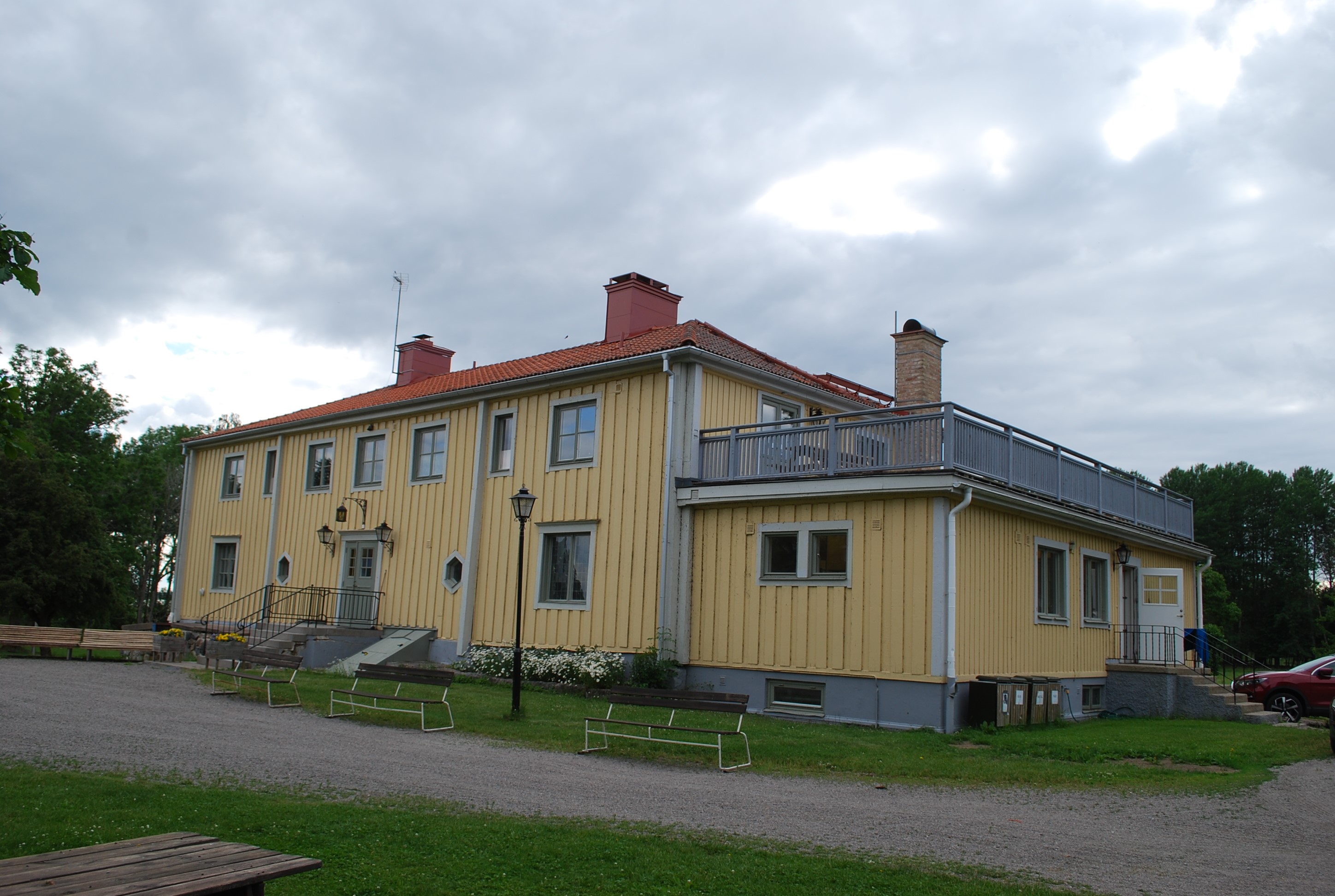 På undervåningen finns det generösa utrymmen i samlingslokaler, kök, kontor, 2 sovrum (4 bäddar) och två toaletter (varav 1 hk).