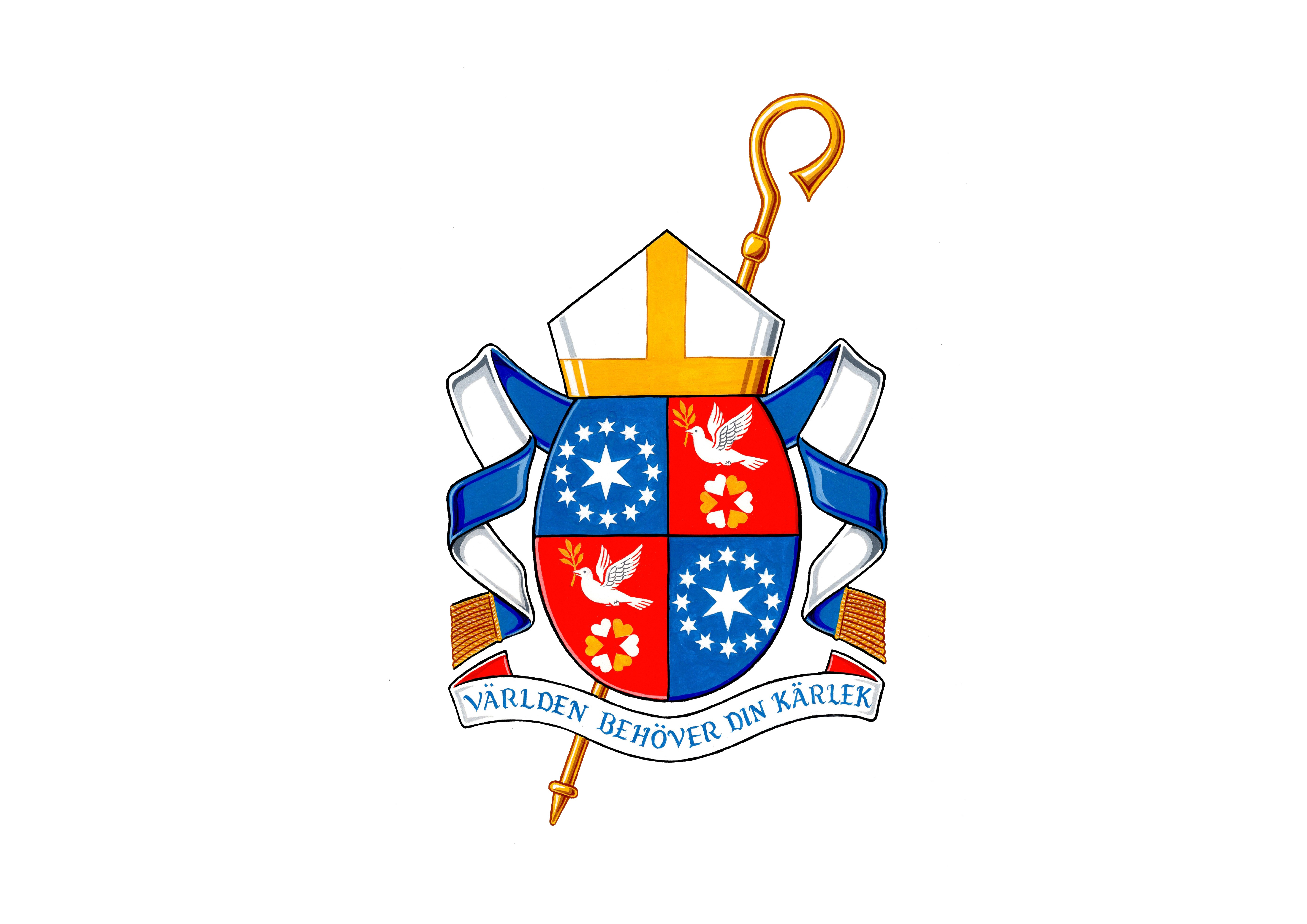 I mitt biskopsvapen finns det en duva och hjärtan i en ring. Duvan är en symbol för hopp och fred och Guds löfte att aldrig överge oss. I första Mosebok (1 Mos 8:8-11) släpper Noa ut en duva för att se om vattnet som dränkt jorden har sjunkit undan. När duvan återkommer en andra gång har den en färsk olivkvist i näbben, tecknet på att det finns fast mark på jorden. Detta är för mig en viktig påminnelse om hur vi, särskilt i de svårare
