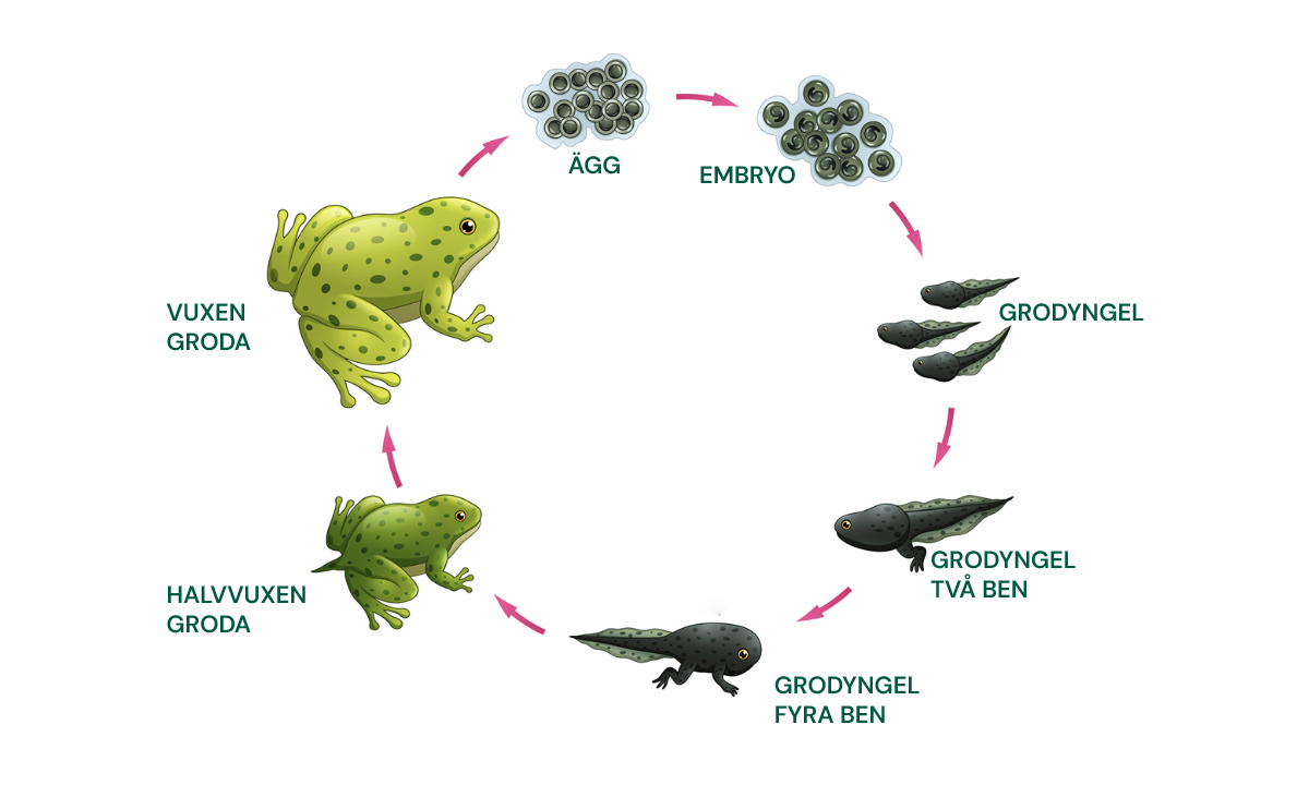 Det finns många olika slags grodor i världen och i Sverige finns 13 arter. Grodans livscykel brukar delas in i fyra stadier: ägg, yngel, halvvuxen groda och fullvuxen groda. Från ett ägg till vuxen groda tar det 1 till 4 månader.