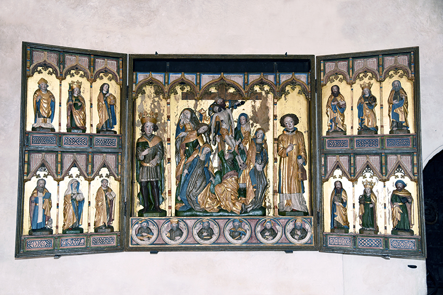 Altarskåpen blev populära under 1200-talet när prästerna började fira mässa med ryggen vänd mot församlingen. I Sollentuna hänger ett skåp från 1475.