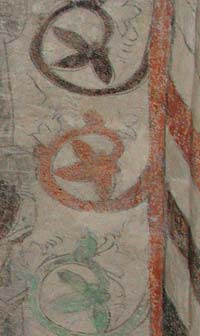 Det man målade vid det tillfället var abstrakta dekorationer. I kanterna, ribborna, av valven ser man dekorationerna som geometriska mönster: