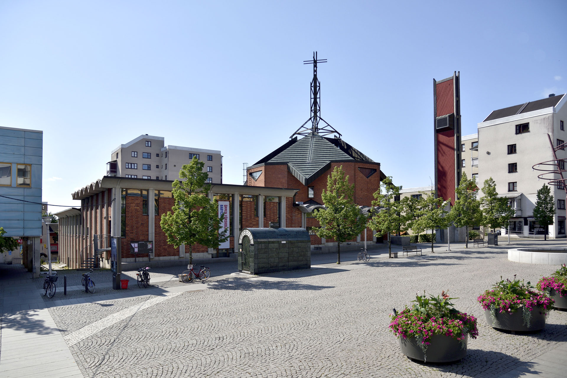 Kyrkobyggnadens plan utgår från det grekiska, liksidiga korset. Korsarmarnas hörn är avfasade och planformen blir därmed oktogonal. I exteriörens bottenplan går inte planformen att avläsa runt om eftersom kyrkan i öster är sammanbyggd med församlingslokalerna. Koret ligger i söder och mot torget i norr finns både församlingshusets och kyrkans huvudentréer. Marken där anläggningen ligger sluttar från norr till söder, vilket ger byggnaden en souterrängvåning i söder.