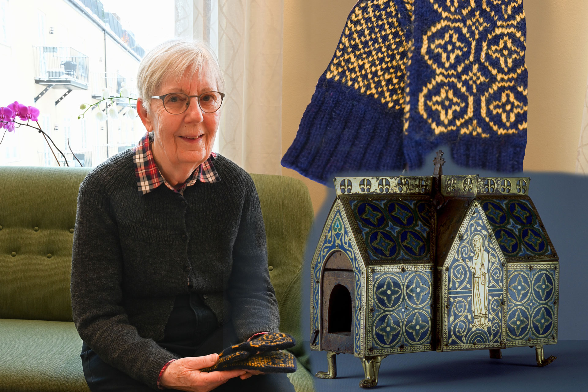 Relikskrinet är tillverkat av ek med förgyllda och blåemaljerade silverplåtar. Här hämtade vi färgerna till vantarna. Relikskrinet såldes till Historiska muséet för 400 riksdaler, det motsvarar knappt 800 000 kr i dagens penningvärde.