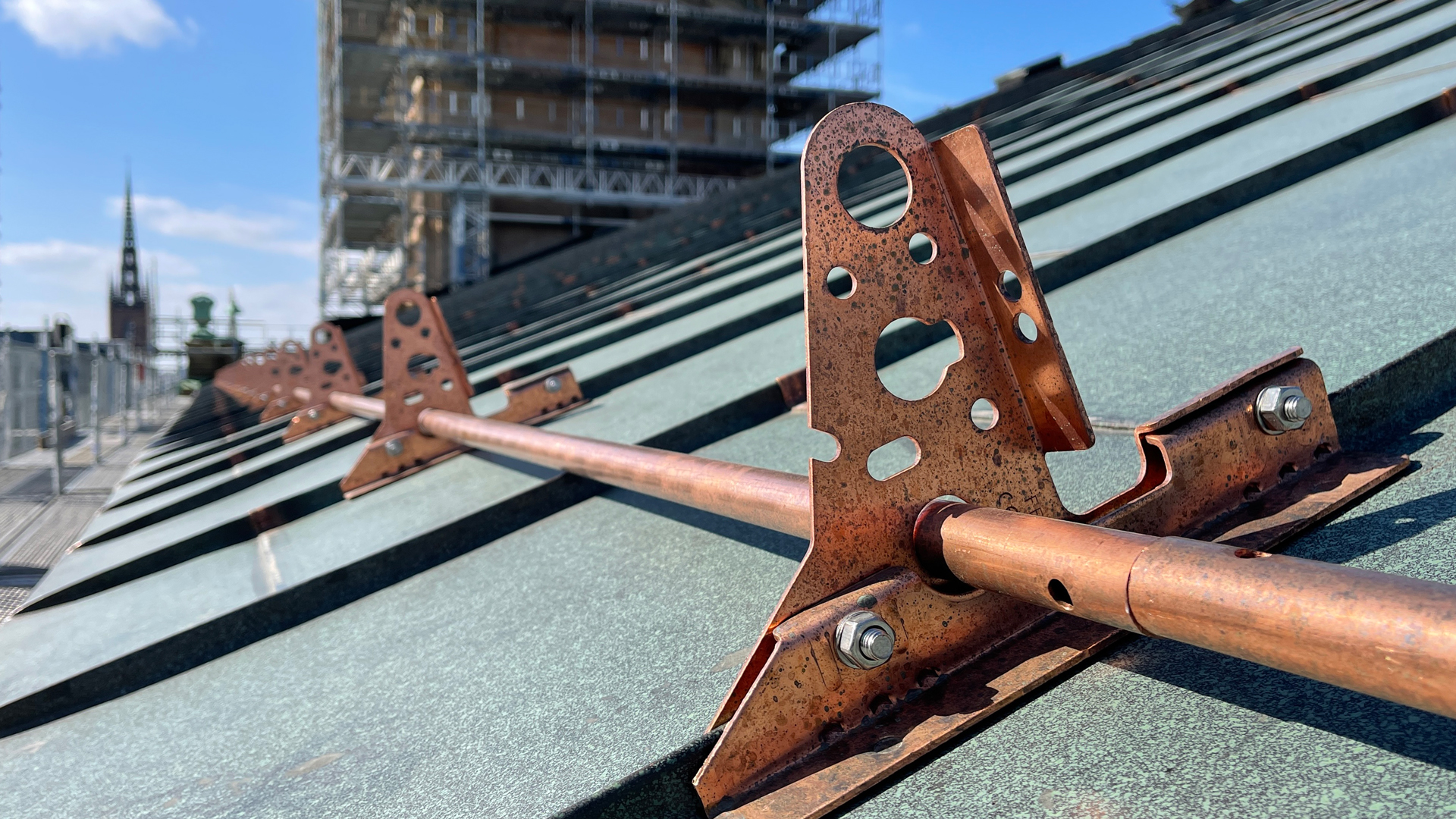 Vi träffar Douglas Eriksson och Alexandr Mats uppe på det övre taket där de lägger. den nya plåten. Kopparplåten kommer i rullar till verkstan. Där delas rullarna upp i mindre ark och sätts ihop i mönster. Längden på själva plåten anpassas för att kunna transporteras. Väl uppe på taket sätts de ihop i sin fulla längd.