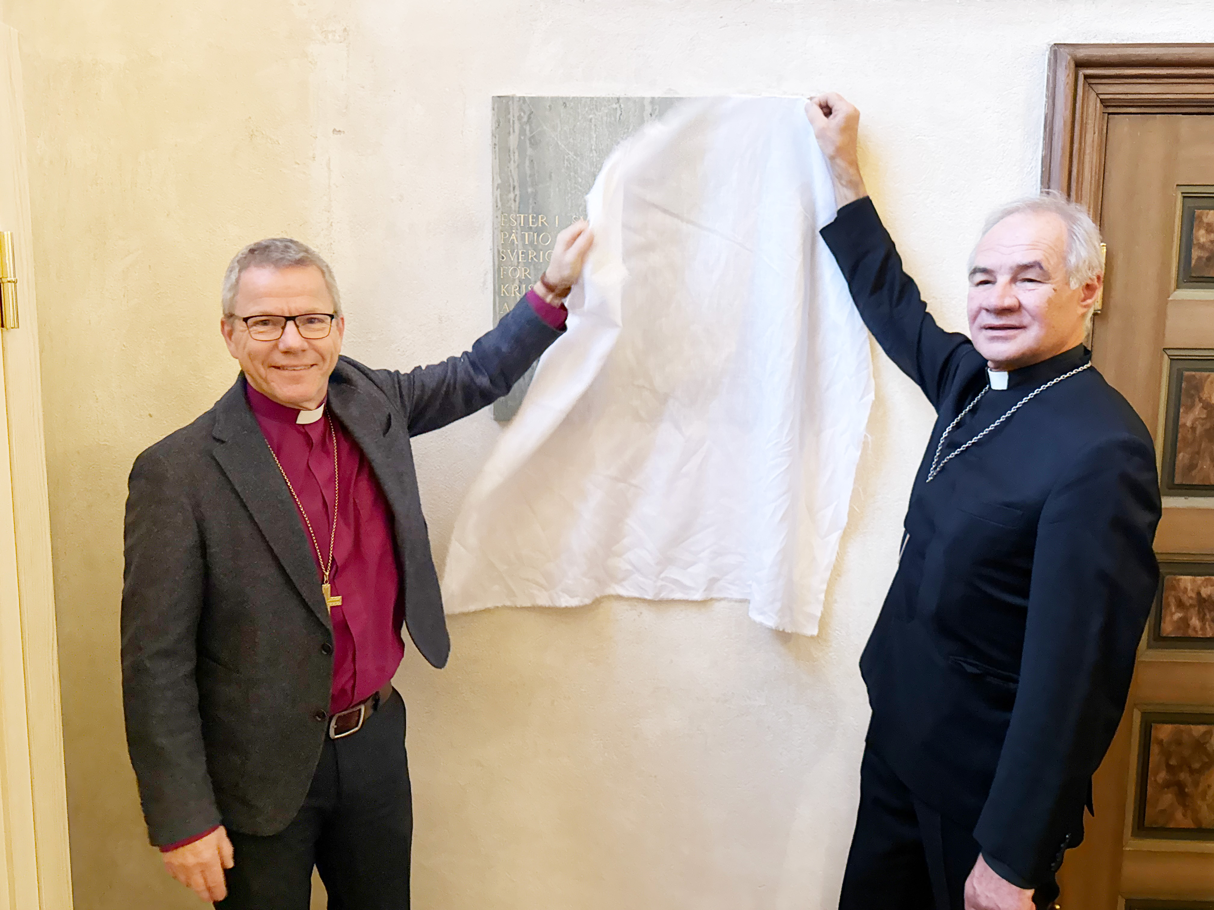 Kyrkoherde Tiit Pädam och biskop Andreas Holmberg återavtäckte i tisdags morse den tacktavla som suttit uppsatt i Sankt Jacobs kyrka sedan 1955 och nu fått sin nya plats. Den vittnar om de tio år som då gått sedan Sovjetunionen ockuperade Estland hösten 1944 och drev omkring 30 000 ester på flykt till Sverige.
