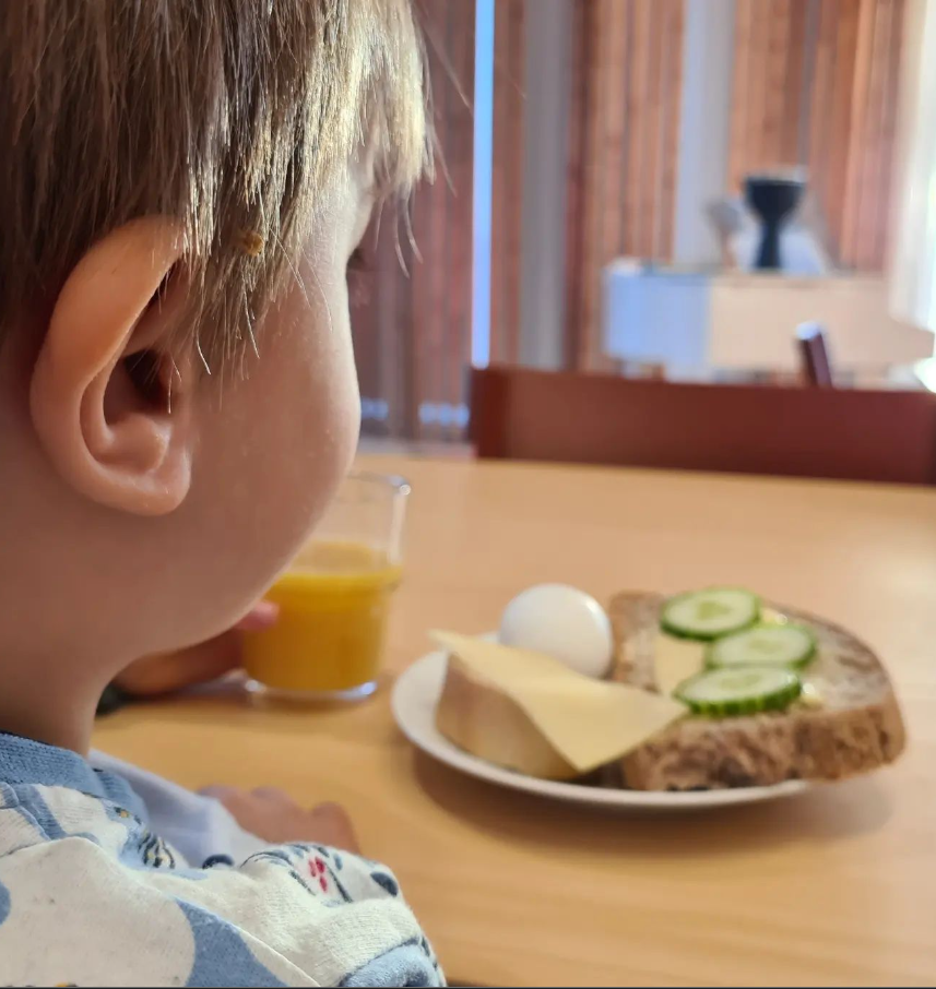 En god frukostbuffé finns framdukad kl 8.45-9.45. Normalt finns flera olika sorters bröd, pålägg, grönsaker, kokta ägg och frukt. Samt förstås kaffe, te, juice etc. Både barn och vuxna brukar hitta något man gillar. Frukosten har inget utsatt pris men var och en inbjuds swisha valfri summa så hjälps vi åt att bära kostnaderna.