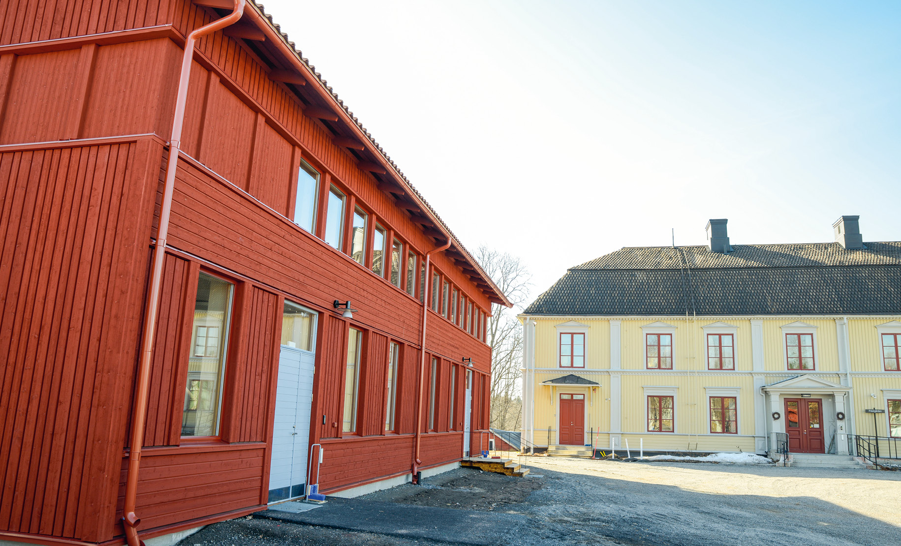 Det nybyggda huset är utformat efter den gamla byggnadens volym, fotavtryck och kulör och ska inte dominera gårdsplanen.