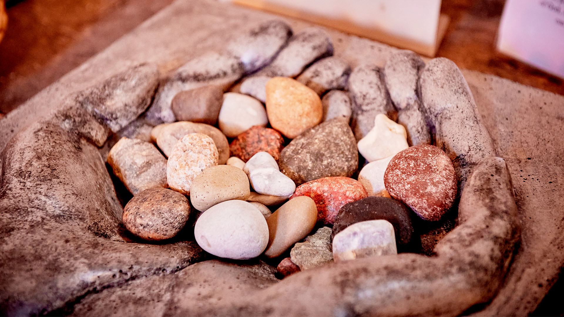 Kanske känner du för att lämna över all din oro i Guds hand? Ta en sten, tänk att du lägger all din oro i den stenen och lägg stenen i den stora stenhanden som symbol för att du nu lägger din oro och förtröstan i Guds händer. (Se bild, stenhanden finns vid en av stationerna när du just klivit in i kyrkan)