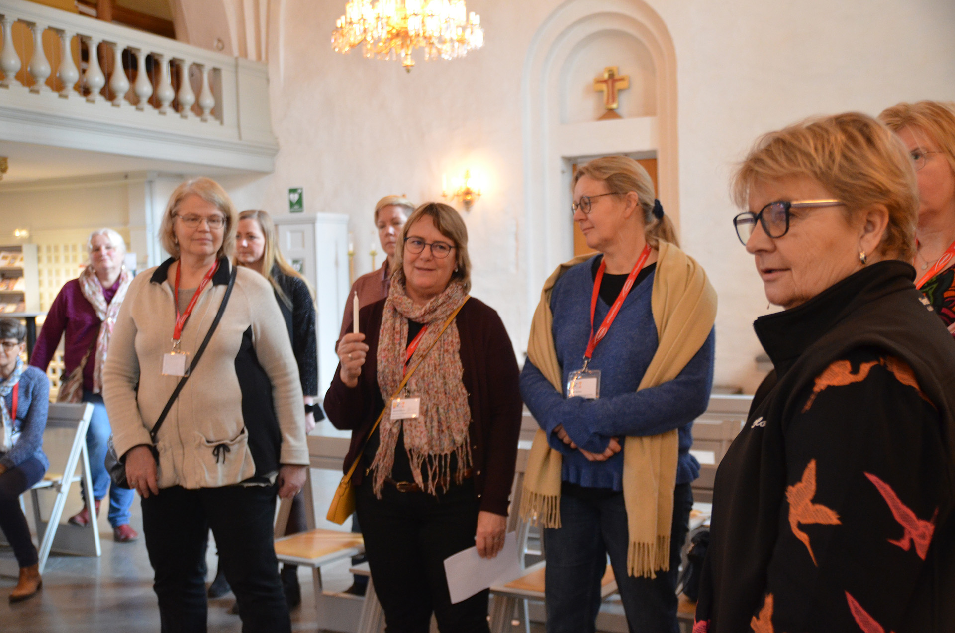 På fredagseftermiddagen kunde deltagarna välja olika seminarier. Upplev en kyrkopedagogisk vandring i Växjö domkyrka var ett av dem. Kyrkopedagogik sker i kyrkorummet och är förankrad i det som kyrkorummet erbjuder. Christina Evertsson, stiftspedagog och med i planeringsgruppen beskriver: