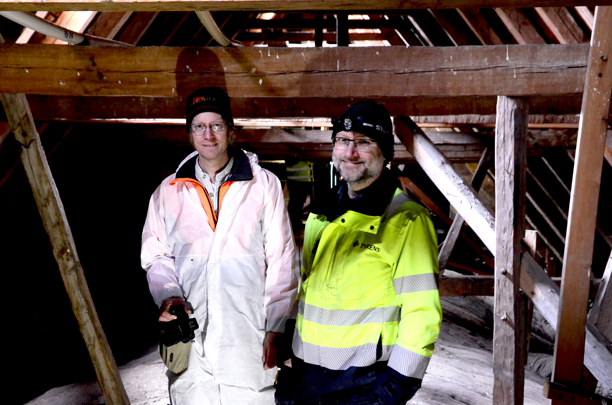 – Här har vi en datering! hojtar Mattias Hallgren, timmerman och hantverksforskare från specialistnätverket Traditionsbärarna, som idag befinner sig i Gärdslösa kyrka på Öland för att inventera medeltida timmerkonstruktioner. Iförd en tunn skyddsoverall har han klättrat upp på kyrkvinden tillsammans med Carl Thelin, teknisk doktor vid Linnéuniversitetet och verksam vid Tyréns AB. Tillsammans gör de en översiktlig inventering, utrustade med ficklampor och kamera.